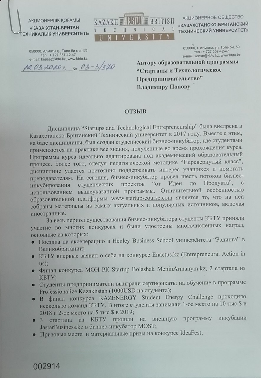 Курс по "Технологическому Предпринимательству и Стартапам" понравился обучаемым. Мы рекомендуем данный курс, в качестве образовательного контента и для подготовки стартапов - от уровня идеи до MVP.