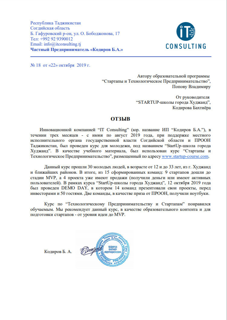 Отзыв от руководителя "STARTUP-школы города Худжанд", Кодирова Бахтиёра