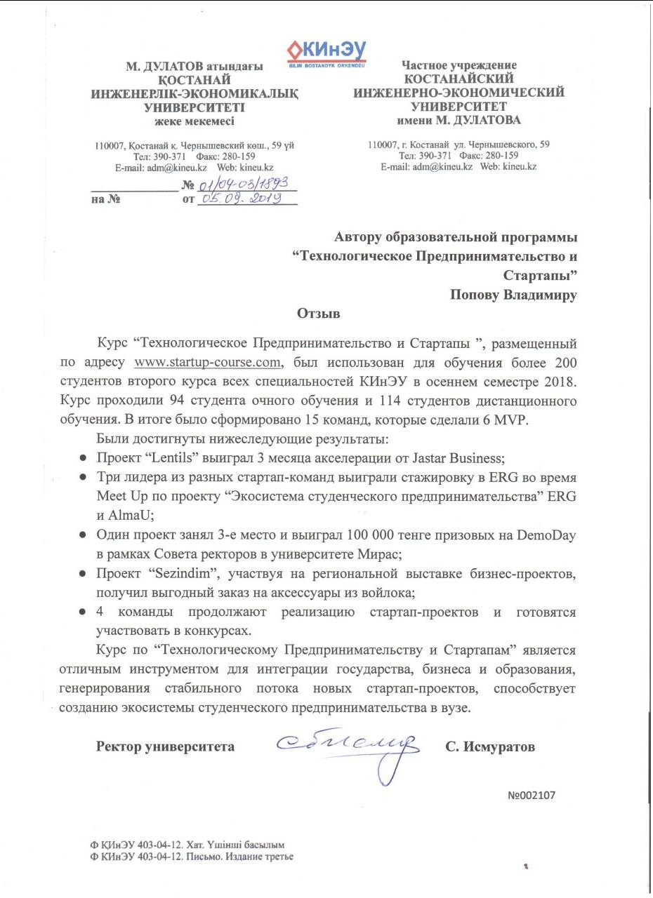 Отзыв ректора Костанайского Инженерно-Экономического университета